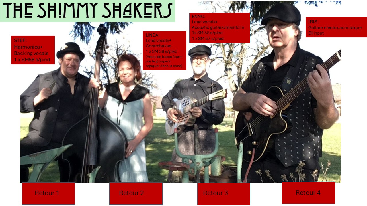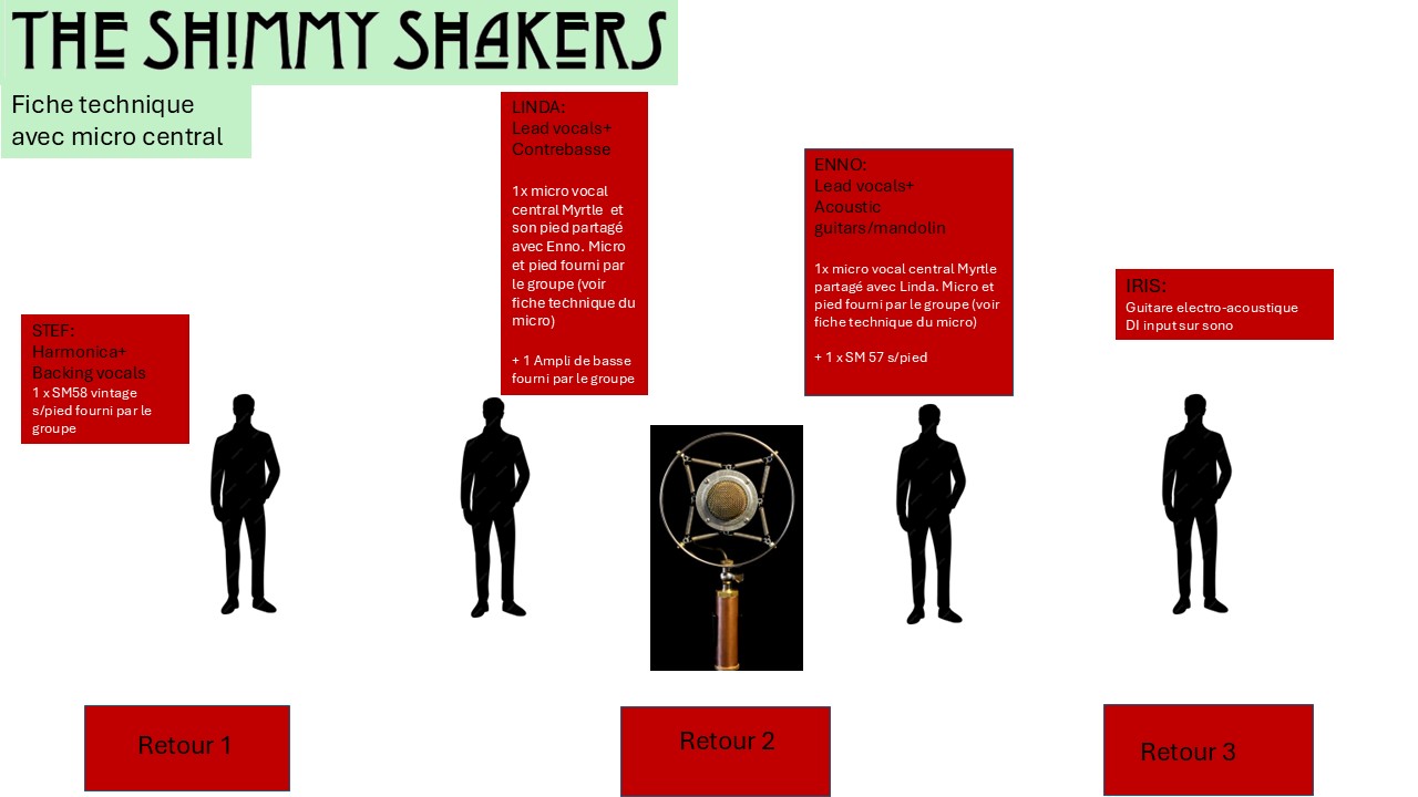 Nous jouons en principe en formule intimiste avec notre propre matériel soit avec un micro central Ear Trumpet Lab (voir photo ci-dessous) et un ampli pour contrebasse et guitare semi-acoustique. Nous pouvons fournir également la sonorisation de la façade si vous n'en avez pas. Cliquez ici pour la fiche technique en formule intimiste.